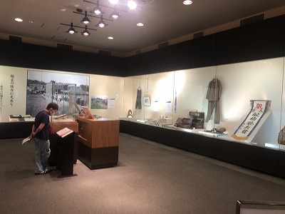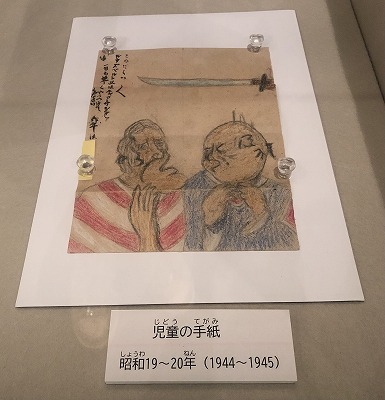 特別展 展示風景 展示内容 片山長三絵日記。教師にあてた児童の手紙。 昭和18年軍服。出征旗。出征時の写真など ![]() 展示室正面 大画面の写真は防火訓練の様子 昭和10年代 ![]() 右に軍服や入営祝いの旗がみえます ![]() 戦争にまきこまれる児童 教師にあてた手紙 「にくい にくい ルウズベルト又はチャアチル・・・」 |