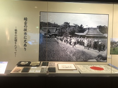 特別展 展示風景 展示内容 片山長三絵日記。教師にあてた児童の手紙。 昭和18年軍服。出征旗。出征時の写真など ![]() 展示室正面 大画面の写真は防火訓練の様子 昭和10年代 ![]() 右に軍服や入営祝いの旗がみえます ![]() 戦争にまきこまれる児童 教師にあてた手紙 「にくい にくい ルウズベルト又はチャアチル・・・」 |